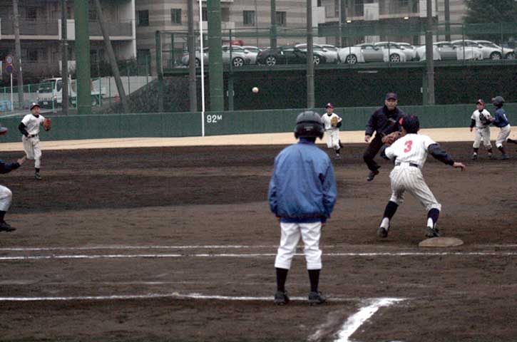 真志の渾身の送球で決勝進出! ボールを捕ったサードは1塁へ全力投球 ショートはサードのカバーをし、セカンドは2塁ベースカバーをし、 オフェンス側のバッターは1塁へ全力疾走し、 判定をする1塁塁審は1塁フォースプレーに備え、素早く送球線に対し垂直の位置に移動しています。 この写真1枚見るだけで、この試合がとってもハイレベルの試合だったことが分かりますね。