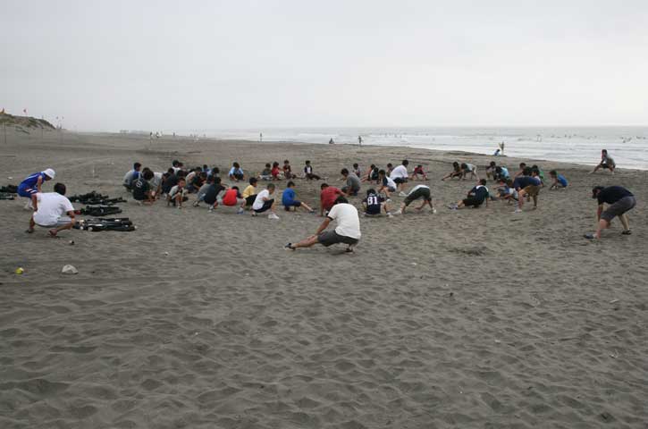 合宿の夜はみんな興奮して眠れないものです。眠い眼をこすってのストレッチ
